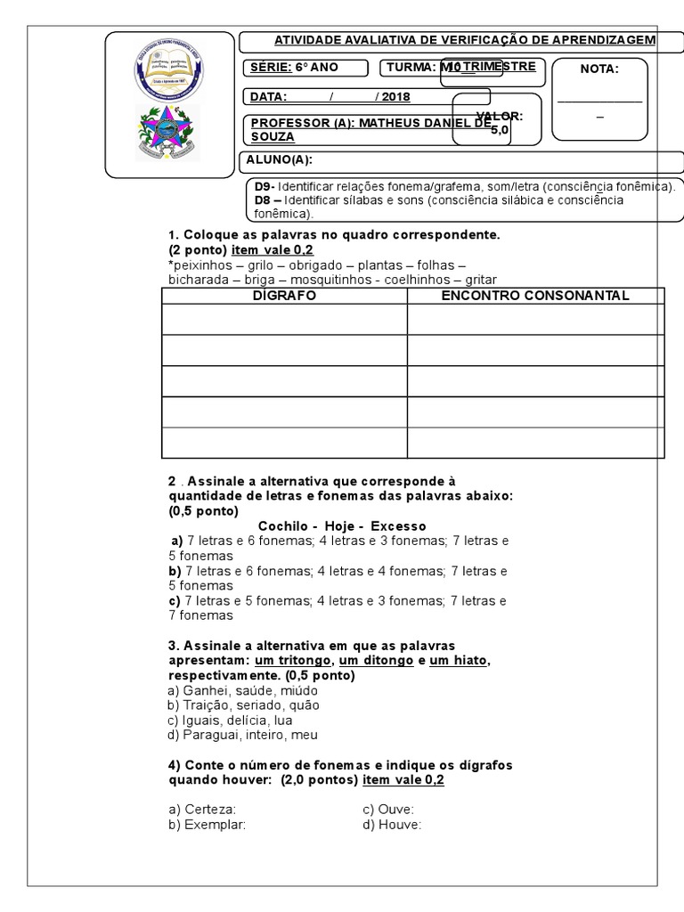 Compra conta nessas palavras, m e n indicam a nasalização das vogais que as antecedem. Veja quais são os fonemas vocálicos: 8 letras e 7 fonemas. A) 4 letras e 4 fonemas b) 4 letras 2 1 fonema c) 4 letras e 2 fonemas d) 4 letras e 5 fonemas 4) quantas letras e quantos fonemas tem.